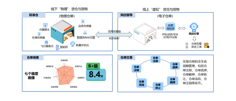 通过在标准仓库内部署AI摄像头、传感器、智能锁、UWB定位等智能设备,完成“物理仓单”与“电子仓单”的数据同步与映射、风控策略执行、预警与风控督导,并根据各维度指标进行仓单画像和评级,实现线上线下仓单监管、画像和交易,如下图所示。